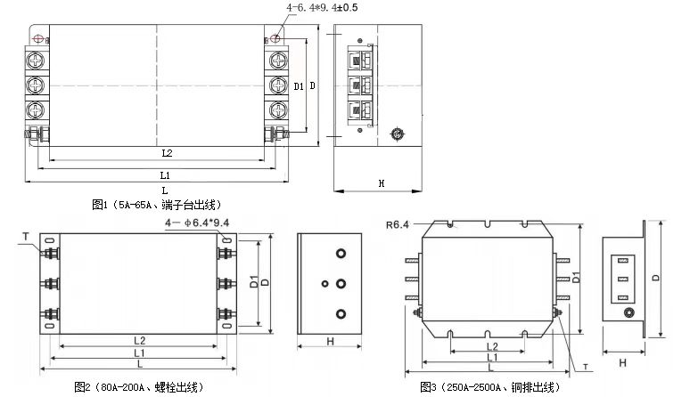 | 產(chǎn)品型號(hào) | 額定電流 | 額定電壓 | 適配變頻器功率 | 泄漏電流 | 尺寸/Size(unit:mm) | 端子 | |||||