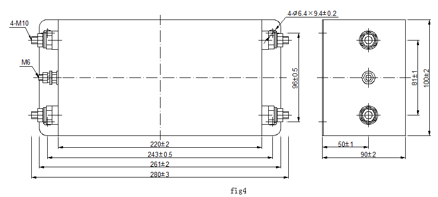 | AC-CFI1C100 | 100A | 125/250V | fig.4 | 1.53Max | 280 | 100 | 90 | 243 | 70 | 4-Φ6.4*9.4 | M8 |