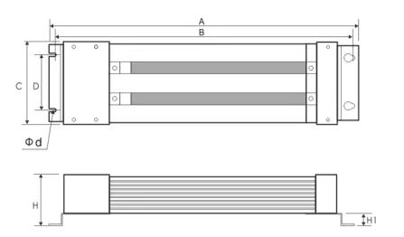 | 型號、功率 | 聯(lián)體規(guī)格 | A(±5)mm | B(±5)mm | C(±3)mm | D(±2)mm | H(±3)mm | H1(±3)mm | Φd(mm) | 配線 (mm2) | 引線長度 (mm) |